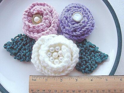 Make these super easy knitted roses, and leaves. They work up very quickly, and you can make them any size by changing the size of the yarn, and the size of the needles. (For a crochet version, see my pattern # ff26)