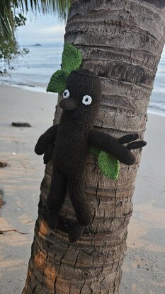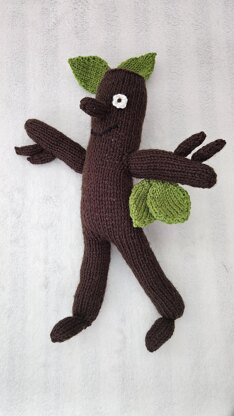 Made from one main knitted legs/body/head piece, two knitted main arm pieces, four knitted arm extra pieces, two feet pieces, one knitted nose piece, and eight knitted leaf pieces to form four leaves. All pieces are hand-sewn together.
