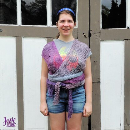This pattern can be found for free online at JessieAtHome (dot) com/knitted-surprise-convertible-wrap/ Knitted Surprise is wearable in a surprising number of styles! Wear it as a vest, an over shirt, a wrap, a scarf, or many other ways. The pattern is also surprisingly easy to knit. With a simple one row repeat, the lace is so easy even a newbie will be able to handle it. Take your time to make sure the crossed section isn’t twisted. The wrap is easily shortened as well.