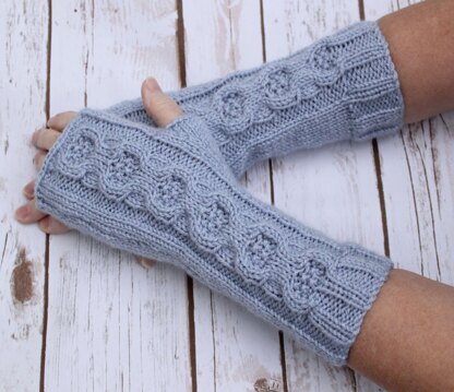 this knitting pattern is for a really warm long pair of fingerless gloves or mitts, in a cable pattern