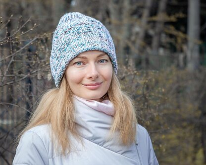 Cozy knit hat pattern is a simple combination of knits and purls, making it fast and easy to make. The cuffed beanie is knit flat in 2x2 rib stitches, it's the perfect pattern for beginners - no complicated shaping. As a bonus, you can add the perfect finishing touch with an oversized pom pom. Suitable wool winter toque cap for girls and women. The three-color melange beanie with cuff, which you can easily make yourself from 3 different yarn colors. Here I combined 1 ball of blue melange and 2 balls of white yarn. Use these or choose yours!