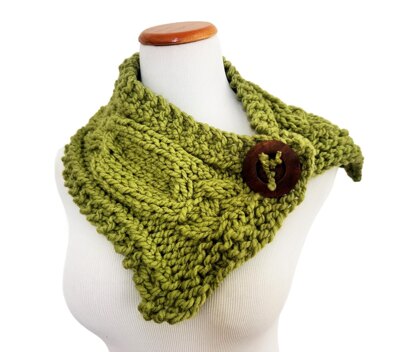 The striking cable pattern in between the garter edges all around makes this cowl pop, that and the fresh Garden green color. The oversized wooden button holds it in place and rather than when knitted in the round, this flat knitted cowl let’s you style it in different ways. Play with it…