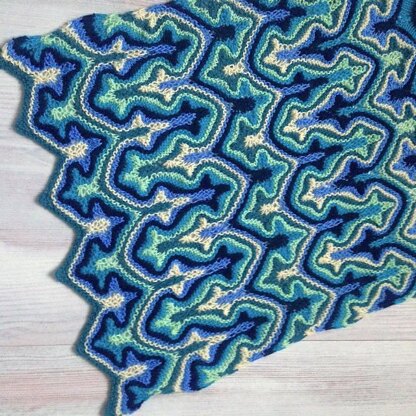 This pattern is mostly knit with just garter stitch and some stacked decreases and increases added in some places. Some familiarity with stacked stitches technique is desirable, but not required. Despite its visual complexity, this pattern is fairly simple. There are no long stacked increases or decreases. The same structural elements repeated on top of each other create tessellated fractals that look like icicles or stalactites. The PDF has instructions for three different stripes in the PDF: two stacked ones (tall and short), and one zigzag. You can arrange those any way you want. There is also a description of a zigzag edge with sharper “teeth”. I think it is decorative on it’s own and goes well with this kind of pattern. I personally think that short-tall-short stripe sequence makes a rich-looking border for anything from wraps to sweaters, and does not need to be complicated with anything else. You can start with it, and then see how you want to continue.