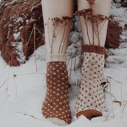 Koffie socks is a simple colourwork project. Great for advanced beginners learning to knit socks and practice stranded colourwork technique.