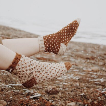 Koffie socks is a simple colourwork project. Great for advanced beginners learning to knit socks and practice stranded colourwork technique.
