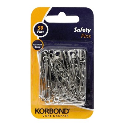 Korbond Safety Pins pack contains an assortment of sizes, ideal for sewing, craft projects and a multitude of everyday tasks.\nContents Include:\n• 50 assorted safety pins made from hardened and tempered steel