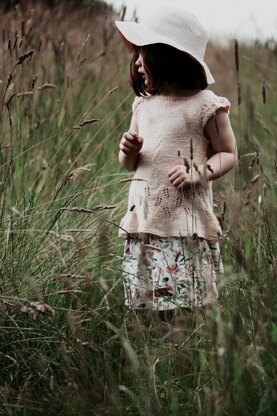German: Die Korn Blus ist eine leger sitzende Tunika im nordischen Stil. Sie ist schlicht, jedoch sorgt das Muster am unteren Rockteil und die Flügelärmelchen mit dem schönen Ajourmuster für das gewisse Etwas.