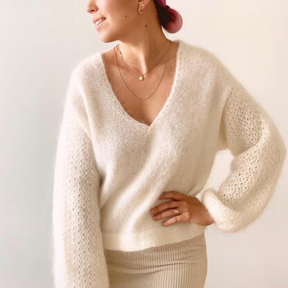 The sweater is knit seamless from the top down with saddle shoulders and dropped sleeves. It’s decorated with an interesting and simple lace stitch at the shoulders, sleeves, sides, and along the neckline. Wide sleeves, v-neck and straight lines guarantee a comfortable fit.