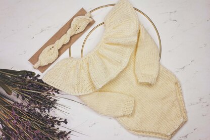 A classic romper with a simplistic top ruffle. This outfit is precious for any age from newborn to 2T. Topped off with a cute leaf headband for extra flair. It would compliment any outfit or outing. A great piece to add to a winter wardrobe. The back is closed with a cute ribbon for which adds a soft accessory into the piece. The bottom closure is sew on snaps for easy diaper changing access.