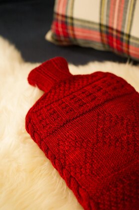 La Mer Douce is a hot water bottle cozy, knit to mimic a traditional fisherman’s Gansey. It uses traditional stitch patterns, cables, and construction elements. The back buttoned flap, boasts a simple heart motif. Knitters would often place theis heart and other motifs on the sweaters they were making - worked with their wishes of love, luck and safe return.