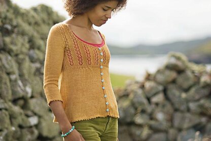 Laar is now available as a single pattern, it was first published in The Shetland Trader-Book One, a collection of 10 patterns inspired by the Shetland Islands. This garment is worked in a lace weight yarn at a loose gauge producing a fabric that can be worn with plenty of negative ease. It’s the feminine touches that make this pretty cardigan a pleasure to wear, delicate picots on the hem and cuffs, a sweet scooped neck, and pleats at an empire waist. This garment is worked bottom up in once piece dividing at the armholes to work back and fronts separately. After the shoulders are joined stitches are picked up from the armhole and the sleeve cap is shaped using short rows. The finished Laar is pictured in Jaggerspun Zephyr Wool-Silk in Curry.