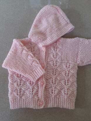 Baby hoodie in lace and moss stitch design, age 0-6 months, chest 18". Actual measurements chest 20", length 10", sleeve 6". Knitted in one piece to armhole