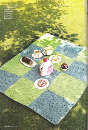 This is a pattern for a Lace and Texture Picnic Blanket, originally published in Knitting magazine. It is made up of squares in two stitches, a simple lace stitch and a cob nut textured stitch. It is sewn up and a crochet edge finishes the blanket. The yarn has now been discontinued, any yarn knitting to the tension can be used or a different tension for a different size. Photo Laurel Guilfoyle for Knitting magazine.
