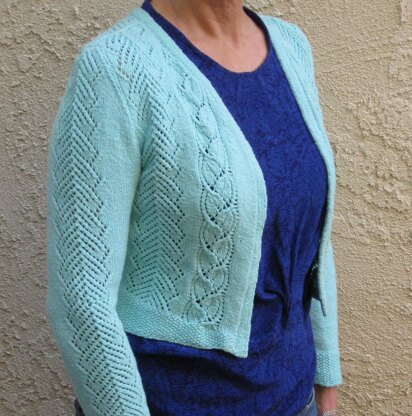 This is a long-sleeved, fitted, short sweater. Features include lace panels on the front, back, and sleeves against a stockinette background. It is finished with a knit band up the front and around the neck. Neckline decreases are done in a lace panel, which can be challenging. There are no buttons or other closures.