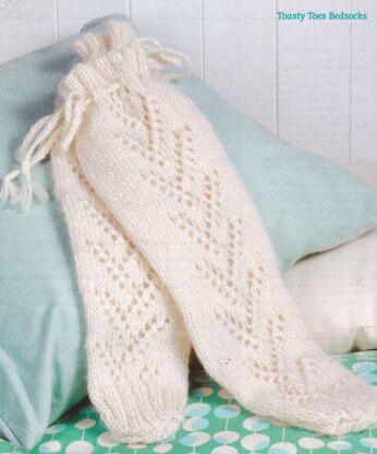 This is a pattern for Lace Detail Bedsocks, originally published in Knit Now issue 4. They are knitted flat with a seam at the back, and are in stocking stitch with a lace detail at the centre front, 2 x 2 rib edges. the top is finished with eyelets and a tie. Photos Knit Now.