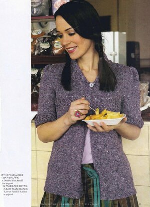 This is a pattern for a Lace Detail Cardigan, originally published in Knitting magazine. It is in stocking stitch with a simple lace detail across the yoke and sleeves. the sleeves are slightly puffed, and it has a collar and three buttons. The yarn has now been discontinued. Any yarn knitting to the tension can be used. Photo Laurel guilfoyle for Knittin g Magazine.