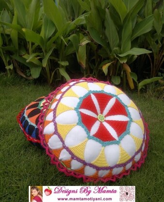 Inspired by the open-work lace designs of Turkish Oya, this Lace Mandala Cushion gives the illusion of a blooming Mandala flower, resulting in negative space. The decorative edging & change of colors are the only exceptions because of which it falls under the intermediate pattern category. The crocheted work involved is less than it appears to be due to negative spaces. Pattern has several picture tutorials.