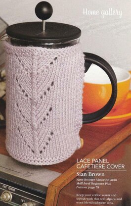This is a pattern for a Lace Panel Cafetiere Cosy, originally published in Knitting magazine. It is in stocking stitch with a lace panel on each side, and garter stitch edges. It fastens with a button. The photo shows the cosy the wrong way up. The arrow lace should be facing upwards, and the button at the top of the cosy. Photo Laurel Guilfoyle for Knitting magazine.