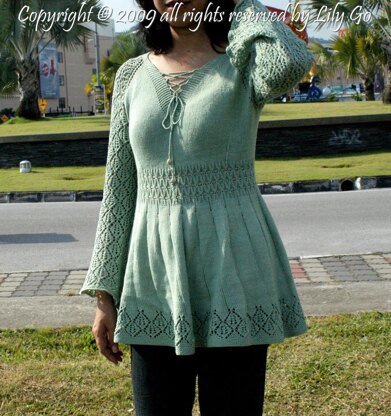 The Lace sleeves Sweater is a sweater with laces on the sleeves and is echoed in the bottom part of the sweater which gives it a romantic and feminine look. The smocking look-a-like stitch in the waist not only causes the sweater to cinch the waist but also adds an interesting detail in this sweater. This sweater can be worked in a light weight fiber (green sample is knit in 100% cotton Baby Georgia) or in DK weight yarn. Alternatively, a wooly yarn can make the perfect fall garment. No shaping in lace is required. All the shaping is done in the stockinette portions of the design. This sweater is knit in around, from top down, and in one piece, so there’s no seaming.