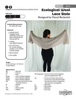 Lace Stole in Cascade Yarns Ecological Wool - A373 - Downloadable PDF is a free Intermediate Knitting pattern by Cheryl Beckerich, available as a Downloadable PDF and includes instructions in English. Super fun to make, this pattern could be your next masterpiece!
