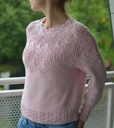 It is a seamless top-down sweater with an interesting lace pattern on the yoke while the rest is made in reverse stockinette (knitted on wrong side). It has a generous ease to give you more freedom of motion.