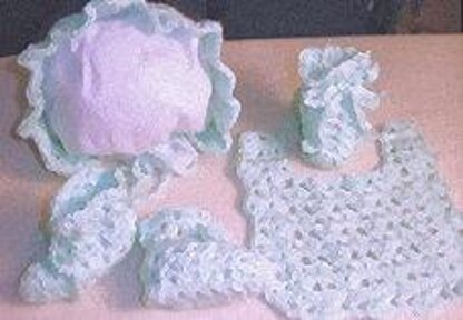Included: Bonnet,Booties, Bottle cover and bib - 2 sizes and diagram of sewing bonnet.