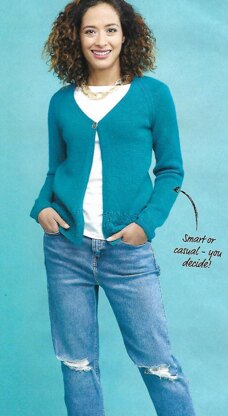 This is a pattern for a lacy checks border cardifan, originally published in Lets Knit. It is in stocking stitch with a lacy checks border pattern, garter stitch edges and raglan sleeves. Photos Lets Knit.