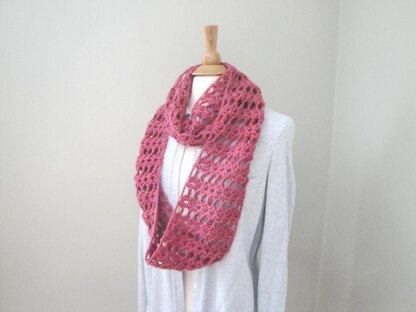 A long or short infinity cowl scarf with a dramatic, airy stitch pattern. Quick and easy! 2 sizes, with a note on customizing length.