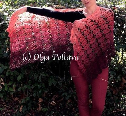 This is a crochet pattern for a lacy shawl (scarf, shoulder wrap) made in lacy fans design with fine, category 2, 100% cotton yarn and a hook size E (3.5 mm). The finished size is about 70 inches long and 22 inches wide. The specific yarn that I used is Cotton Kings Twirls Deluxe, color 25. I used up the entire cake, which is 1093 yards.
