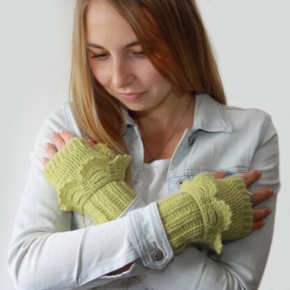 These pretty crocheted fingerless mitts feature a feminine lace cuff making them both stylish and practical.
