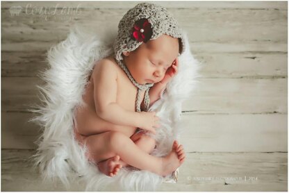 This is a PDF crochet pattern for a sweet vintage-style bonnet with a shell stitch and crocheted ties, in six sizes. Optional: add a fabric flower.
