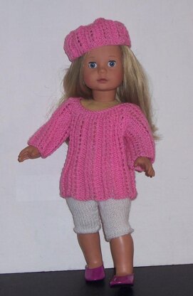 This lacy sweater outfit features an overall easy 2 row lacy pattern, there is a 3 button opening at the back for easy dressing. A jaunty hat in the same pattern and a pair of casual cropped pants complete the outfit. This pattern is my own design