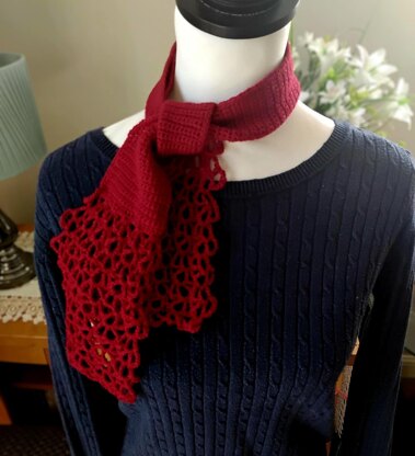 I call this design the waterfall scarf, as the lace detail at the ends reminds me of cascading water. The design is very versatile. It can be worn with a single knot to the front or side, and you can also add your favourite brooch to lengthen the scarf's look. Alternatively, it can be worn as a headband.