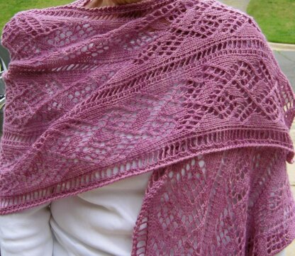 This is a pattern for a light weight wrap. It’s heavier than a shawl, but just the ideal weight for a spring or fall evening, or even if you’re sensitive to air conditioning in the summer. It knits up fairly quickly and would make the ideal gift, for yourself or someone that’s very special to you. It is made up of two different lace stitches. Both are both written out line by line, and charted. The final size is 18 inches by 72 inches. There are also instructions for an optional edging contained within the pattern, should you want it edged.