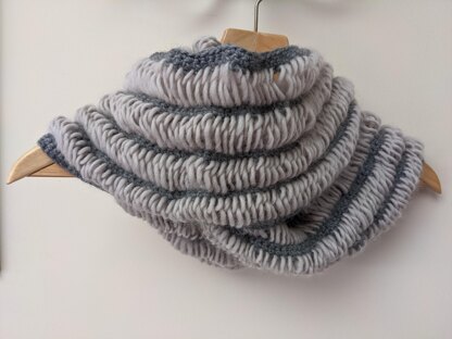This cowl has a lovely, lofty feel to it and once you have mastered the loopy stitch is very quick to make. The loops or ladder effect is made by drawing out a long loop on each double crochet stitch that you make, you do this by wrapping the yarn over a ruler or piece of card. The cowl is designed so you can wrap it around your neck twice to make it nice and snuggly. It is made flat and then seamed. We quite like using two contrast colours, however, just one colour would like lovely too with the benefit of only needing 3 skeins of Plump DK.