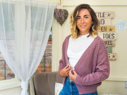 An edge to edge cardigan with stotcking stitch sleeves featuring cable detailing.