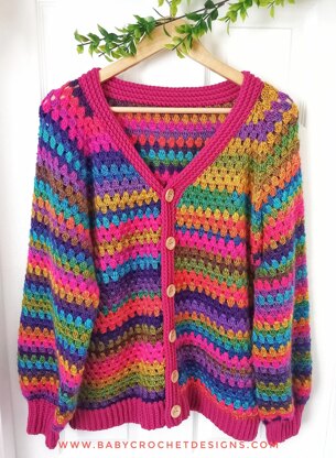 This cardigan is worked from the top down in one piece, using the granny stitch. It's quick and easy to work up and is great for using up scrap yarn.