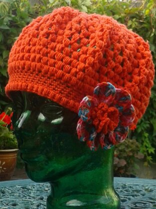 Hat is made using the puff stitch to create a lovely textured pattern. Crochet flower is made in two parts to give a 3D flower.