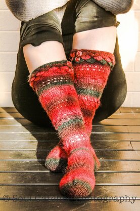 Yarns suggested are DK / 8ply. You will need around 500m to complete a pair with 1 row of Crocodile Scales around the top. More yarn (up to 100m) will be required to complete more rows of 'Crocodile Scales'. I have suggested some lovely yarns, but your favourite DK yarn (or 2 strands of sock yarn) would be ideal.