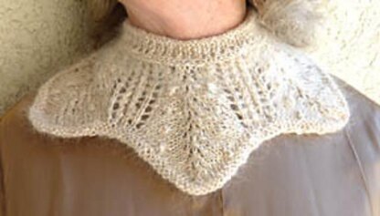 Here’s a fancy collar to wear two different ways: with the opening in back, or opening in front, to show off a treasured brooch. Either way, it adds an old-fashioned, feminine flair to a plain garment. For a really rich-girl look, make it in a mohair, cashmere, or angora blend. Don’t let the knots put you off; they’re lots easier to make than bobbles.