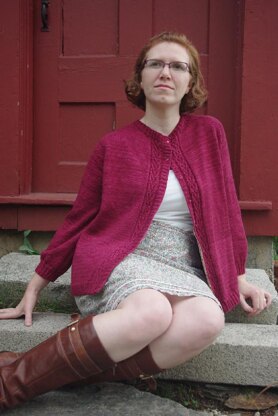 A swingy seamless A-line cardigan with a lady-like heart cable feature along the button bands.
