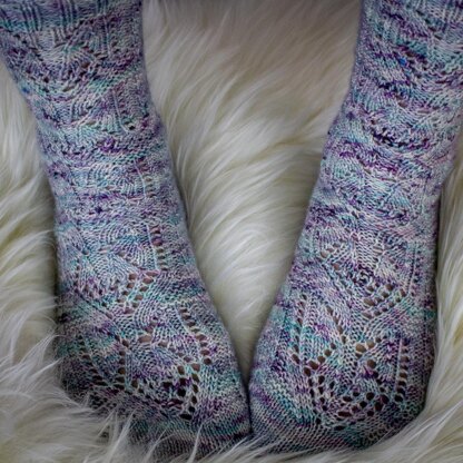 The shifting eyelets and mermaid tails seemed all too perfect for the Mermaid Lagoon colorway from Lofty Loops. The combination of speckles and hues make a big splash with these addictively fun socks.