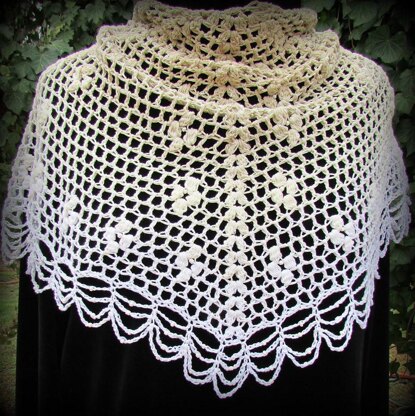 Instructions are given for a regular size and larger size shawl. There are three charts and written instructions.