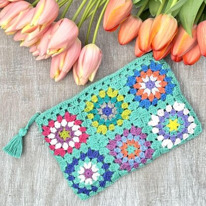 Lagoon Pouch is a happy colourful pouch made of 12 motifs that are joined together as-you-go.