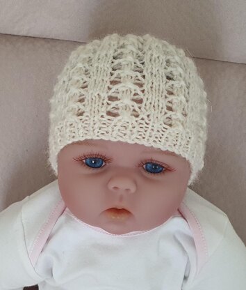 This 8ply Beanie is worked in a lovely but simple lace stitch and has a rib brim. The crown shaping rows are written out for you, to help keep the lace stitch going correctly.