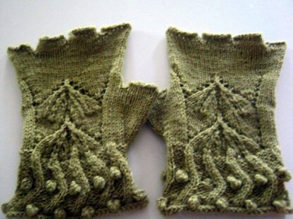 Leaves and Vines Fingerless gloves with a cabled and bobbled cuff, lace leaves across the back, short fingers, and stockinette across the palm.
