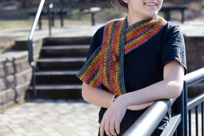 A multitude of fall colors creates a fun little scarf that's oh-so- easy to crochet and even easier to wear. Style it with your favor- ite shawl pin, or tuck it into the collar of a denim jacket to add a pop of color.