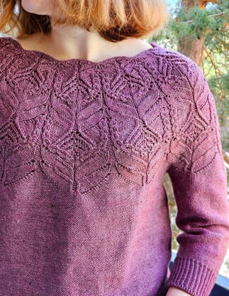 LALEA is a seamless top-down sweater with a scalloped neckline and an intricate lace pattern on the yoke while the rest is made in reverse stockinette (knitted on wrong side).