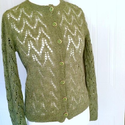 An all-over lace cardigan with a round neck and long sleeves. Has at least 2ins of positive ease. Requires 7 buttons
