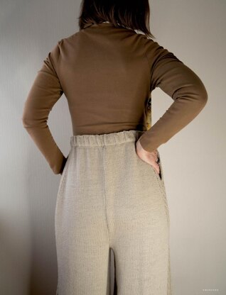 Laplace are Palazzo Pants; long, wide-legged and worn high with an elasticated waistband. Named after the mathematician Pierre-Simon Laplace are these trousers with side seam cables and pockets. The remaining parts are knitted in stockinette stitch to make the cable stand out. Laplace is worked flat in four pieces for the ultimate fit and made to be worn with the Khayam jacket as a set. Why not make Laplace into culottes by making them shorter, to below the knees? Both are knitted in the Bendigo Classic 5 ply with a crepe construction.